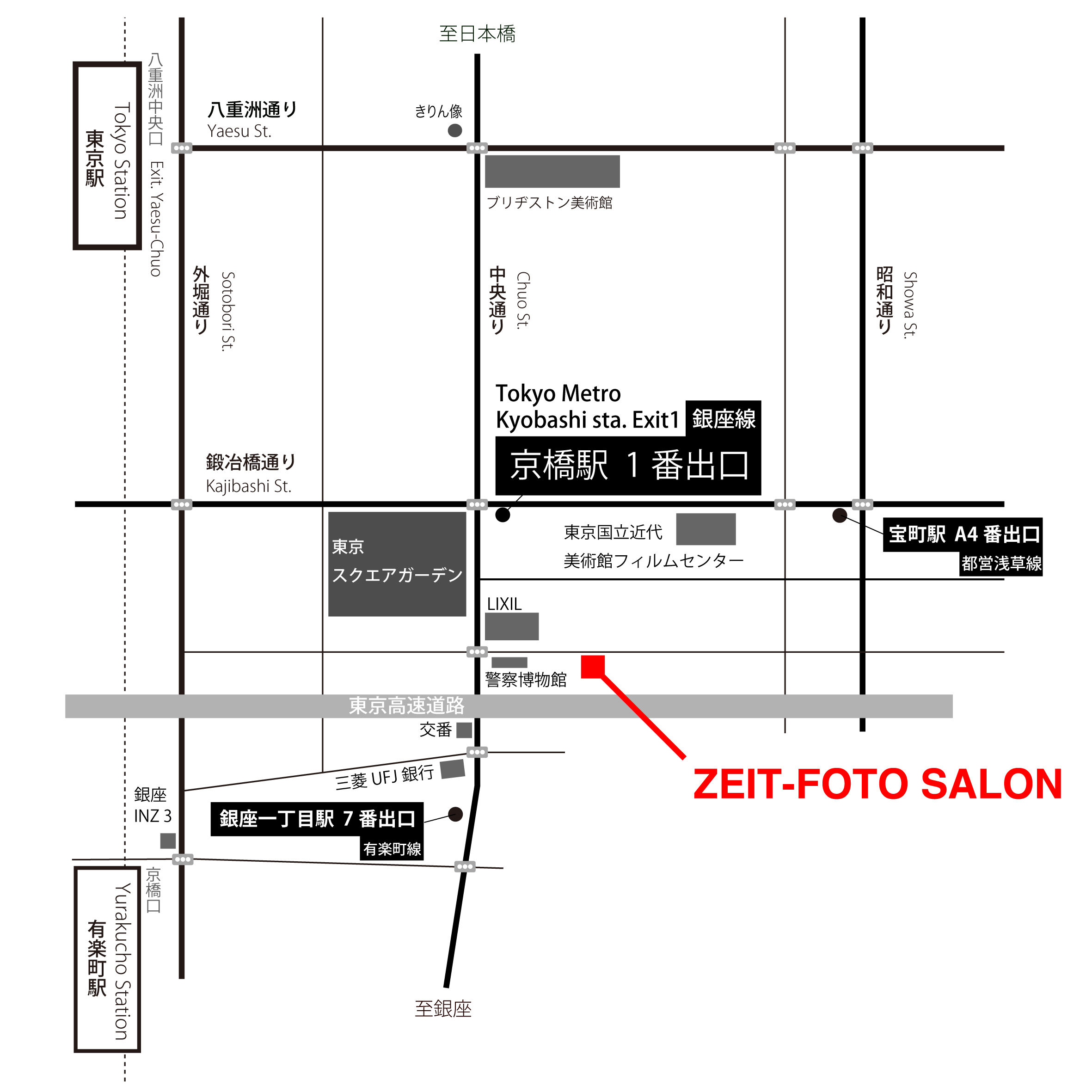 ・JR東京駅 八重洲中央口から徒歩25分 c・東京メトロ地下鉄銀座線 京橋駅1番出口から徒歩3分 ・東京メトロ地下鉄有楽町線 銀座一丁目駅7番出口から徒歩5分 ・都営地下鉄浅草線 宝町駅A6出口から徒歩5分 ・JR有楽町駅 京橋口から徒歩15分